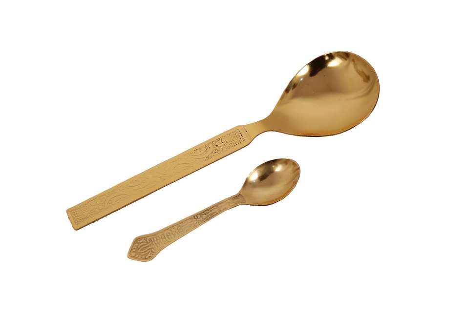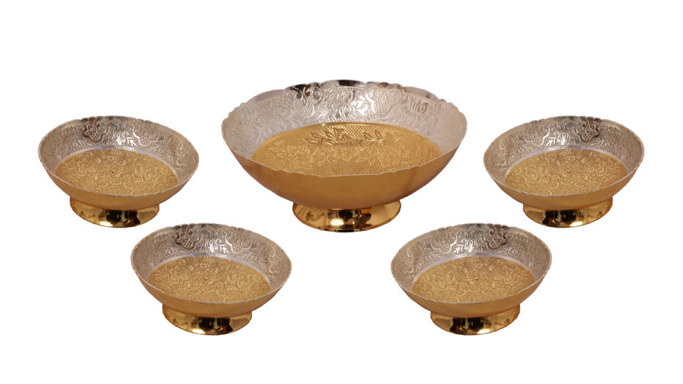 Handmade Golden Brass Bowl with Spoon and Tray Serving Set Disposable Set of 9 Pieces in Velvet Box for Parties