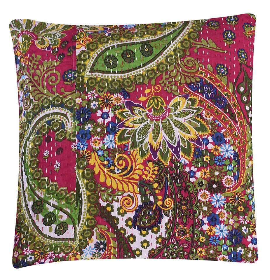 Handmade Green Kantha Cushion Cover Vintage Floral Wildflower Print Square Pillow Fabric Quilted Decorative Throw Festival