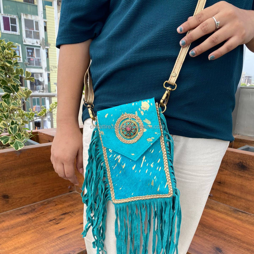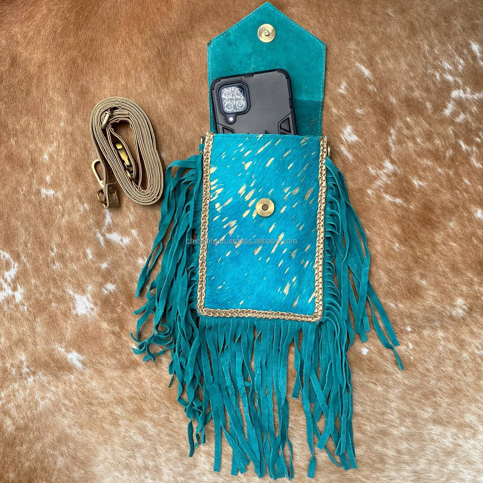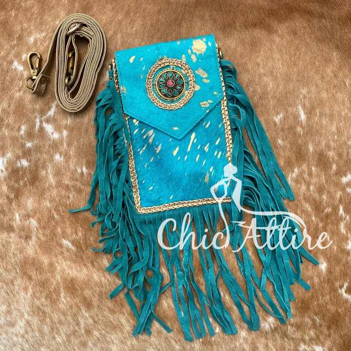 Handmade Hair on Metallic Cowhide Turquoise Fringe Women Crossbody Mobile Bag Western Genuine Leather Concho Cell Phone Purse