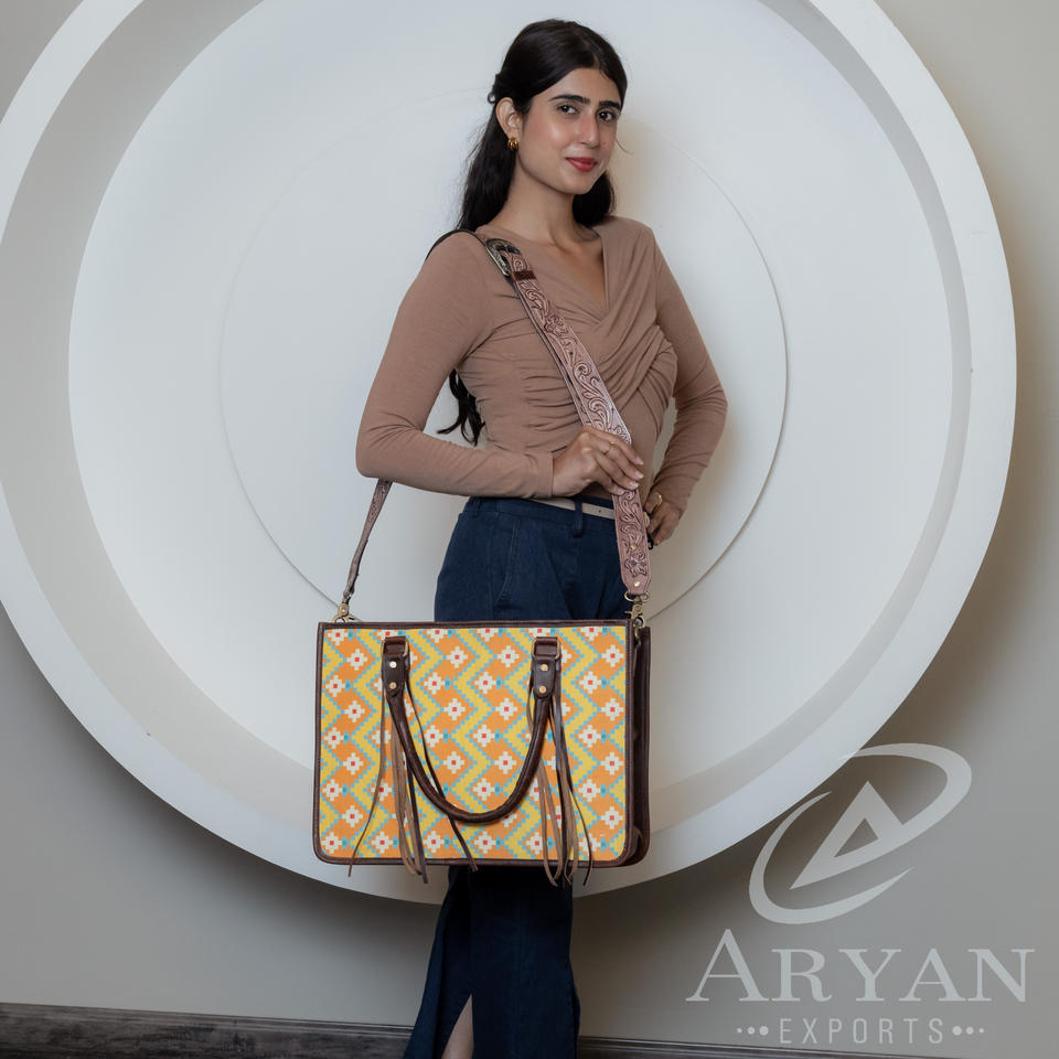 Product name:Hand Tooled Leather Canvas Tote Bag