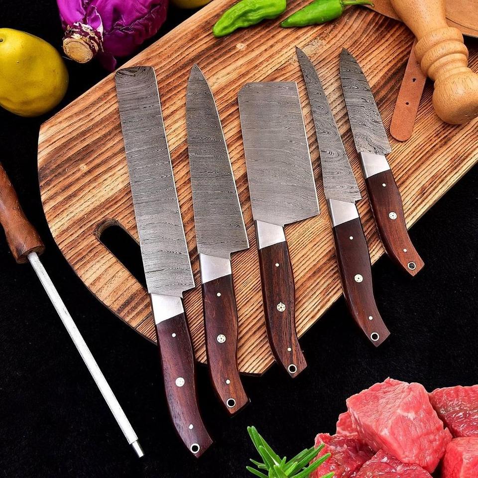 Handmade High Carbon Steel Blade 5-Piece Ambidextrous Kitchen Chef Knife Set Sharp Edge for Outdoor Cooking Padded Leather Pouch
