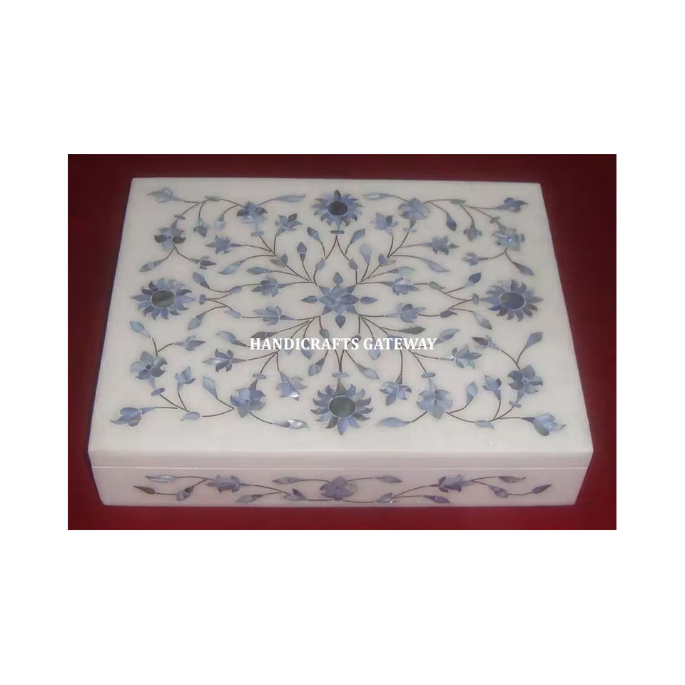 Handmade High Quality Polished White Marble Classic Attractive Inlaid Design Blue Mother Pearl Jewelry Boxes Business Gift Home