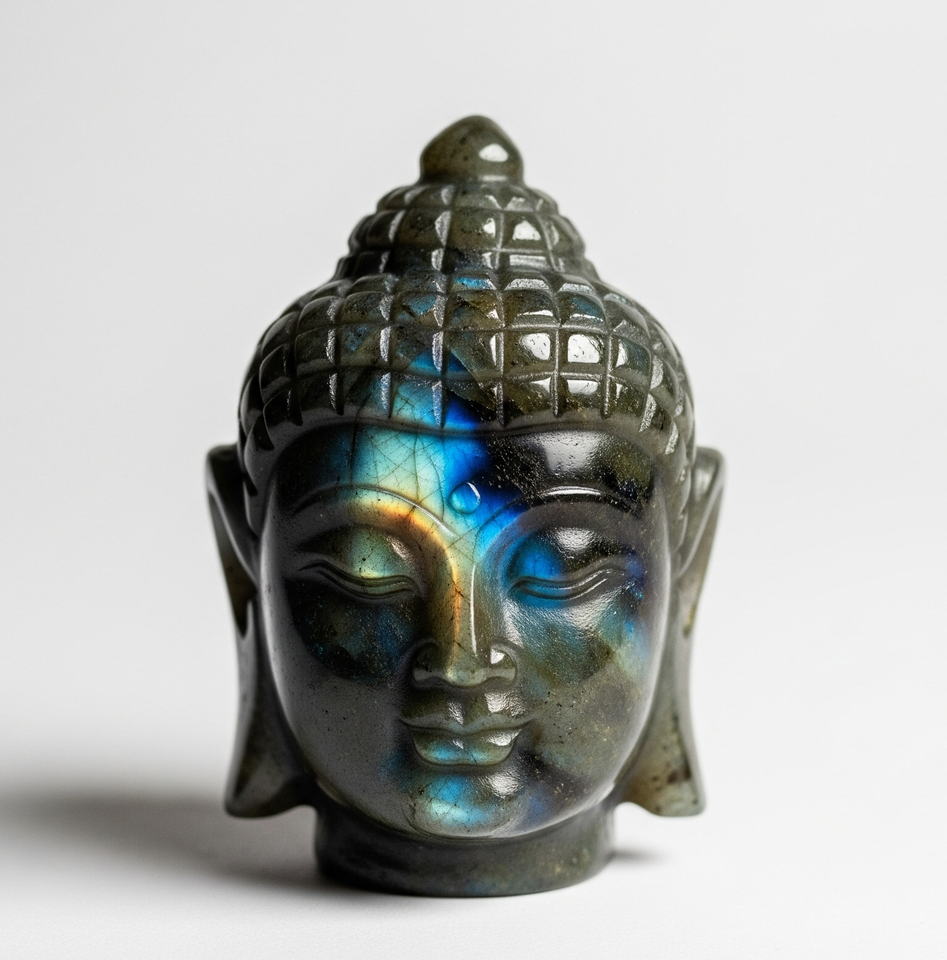 Handmade India Lord Buddha Head Statue Carved Natural Labradorite Gemstone Semi-Precious Stone Crafts Religious Engraving Stone