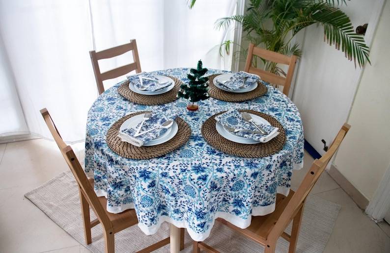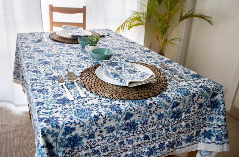 Handmade Indian Block Print Tablecloth Vintage Blue Floral Cotton Cover for French Dining Table Classic Kitchen Decor