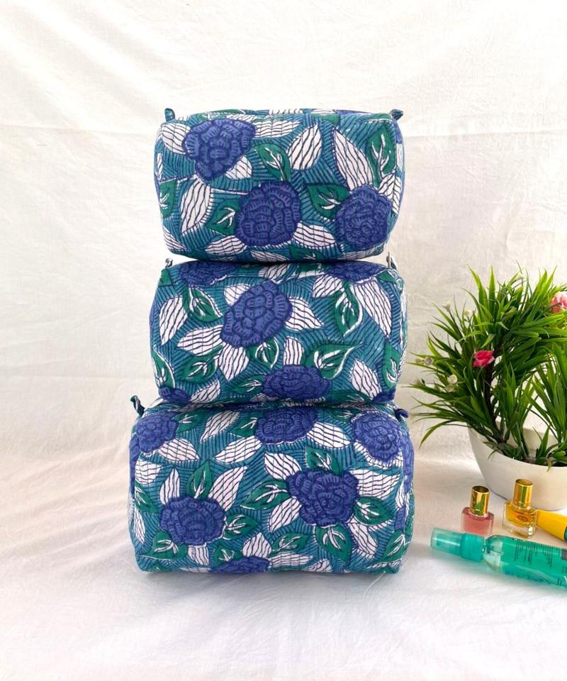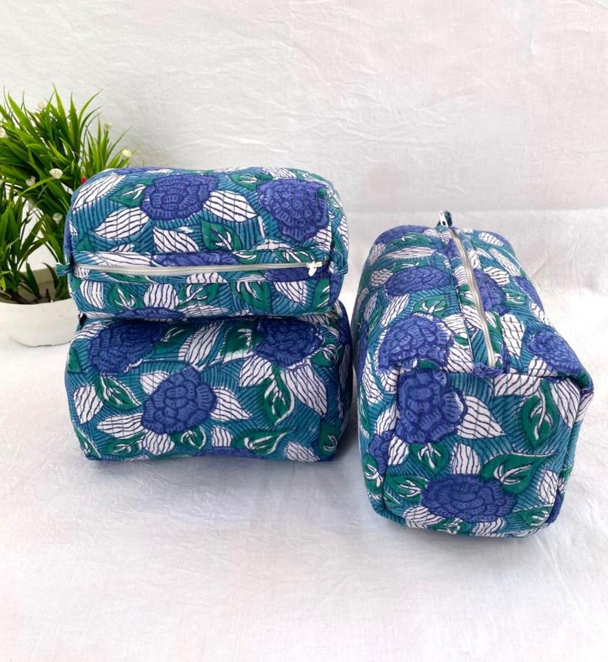 Handmade Indian Blue Floral Print Vintage Eco-Friendly Cotton Case Cosmetic Bag Travel Pouch Set Water Resistant Durable Small