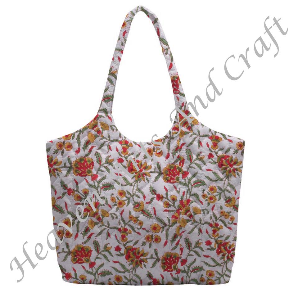 Handmade Indian Cotton Puffer Quilted Tote Bag Jhola Beach Quilted Bag With Hand Block Print Short Length For Shopping & Grocery