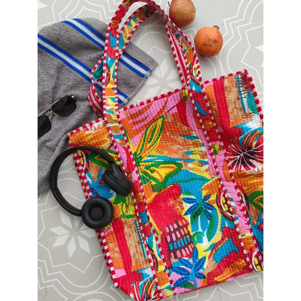 Handmade Indian Quilted Cotton Tote Bag | Eco-Friendly Reusable Fabric Carry Bag.Coral Beach Zippered Tote Bag