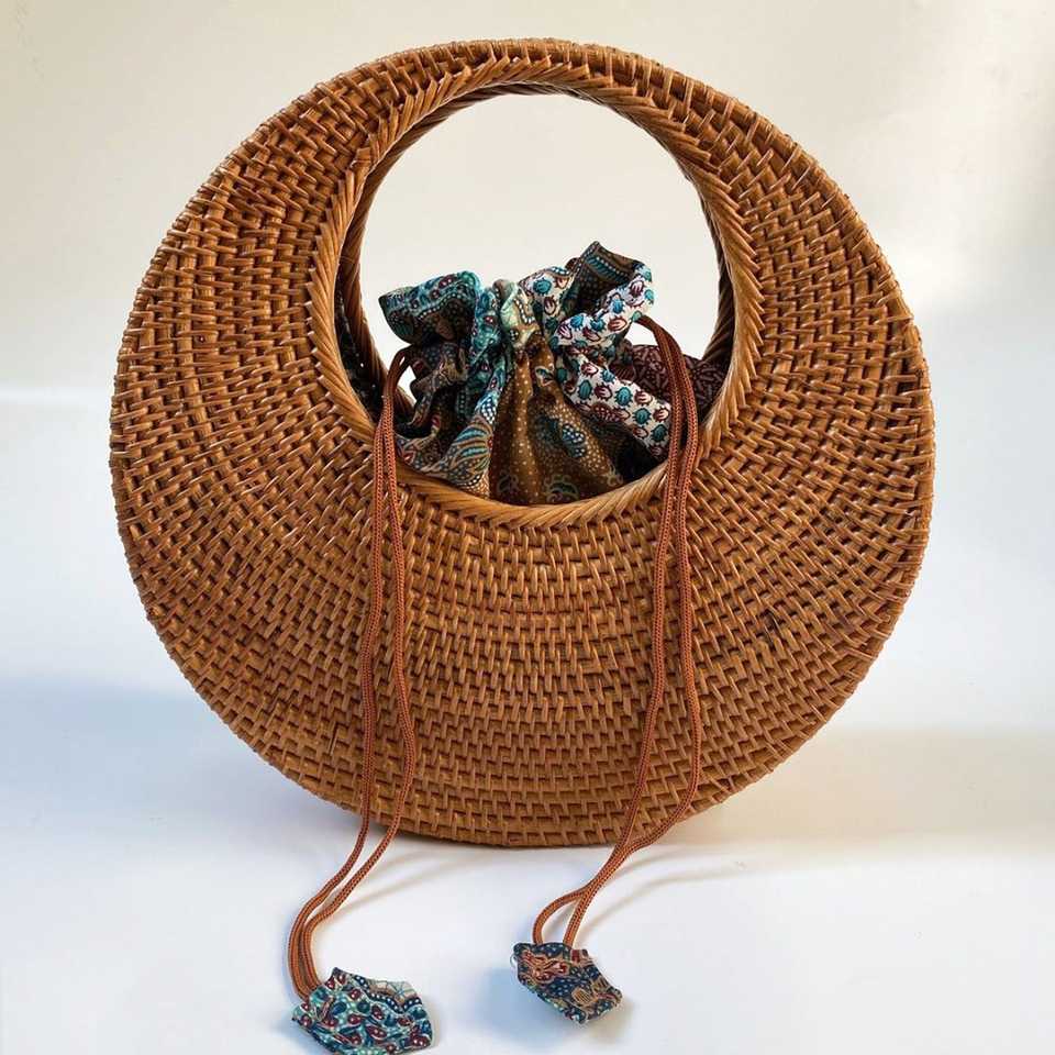 Handmade Indonesia Half Moon Casual Tote Rattan Clutch Bag Shoulder Handbag Open Closure Beach Summer Chains Letter Rivet Tassel
