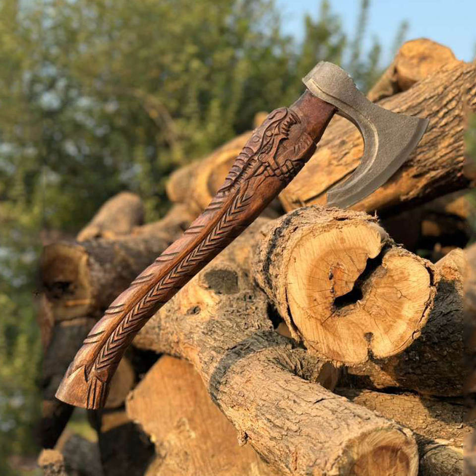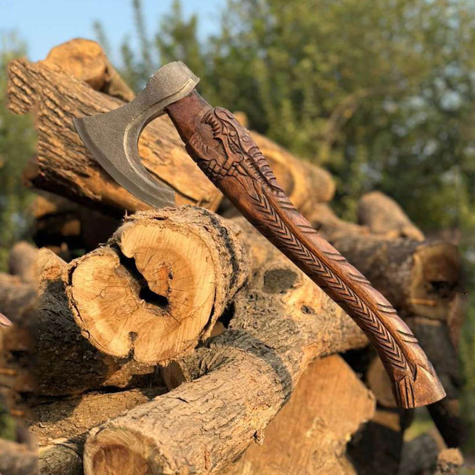 Handmade Industrial Viking Style Wooden Handle Axe with Carved Grip Traditional Outdoor Camping Bushcraft Wood Chopping Tool