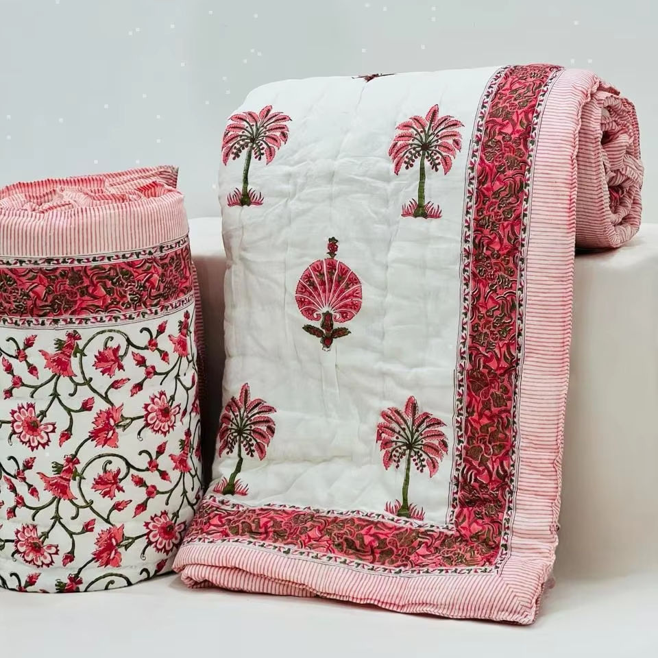 Handmade Jaipuri Indian Cotton Reversible Quilt Floral Hand Block Print AC Comforter Breathable Quilted Bed Cover Bedspread