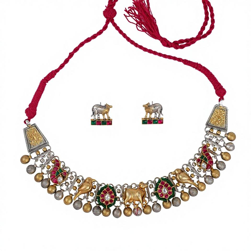 Handmade Jewelry Necklace Set with Cow Bird Motifs Kundan Work Oxidized Silver-Gold Finish Ethnic Indian Design