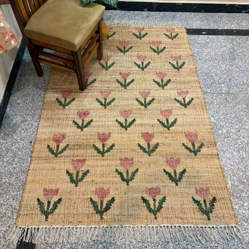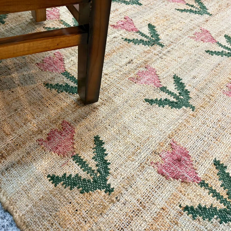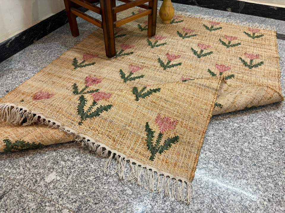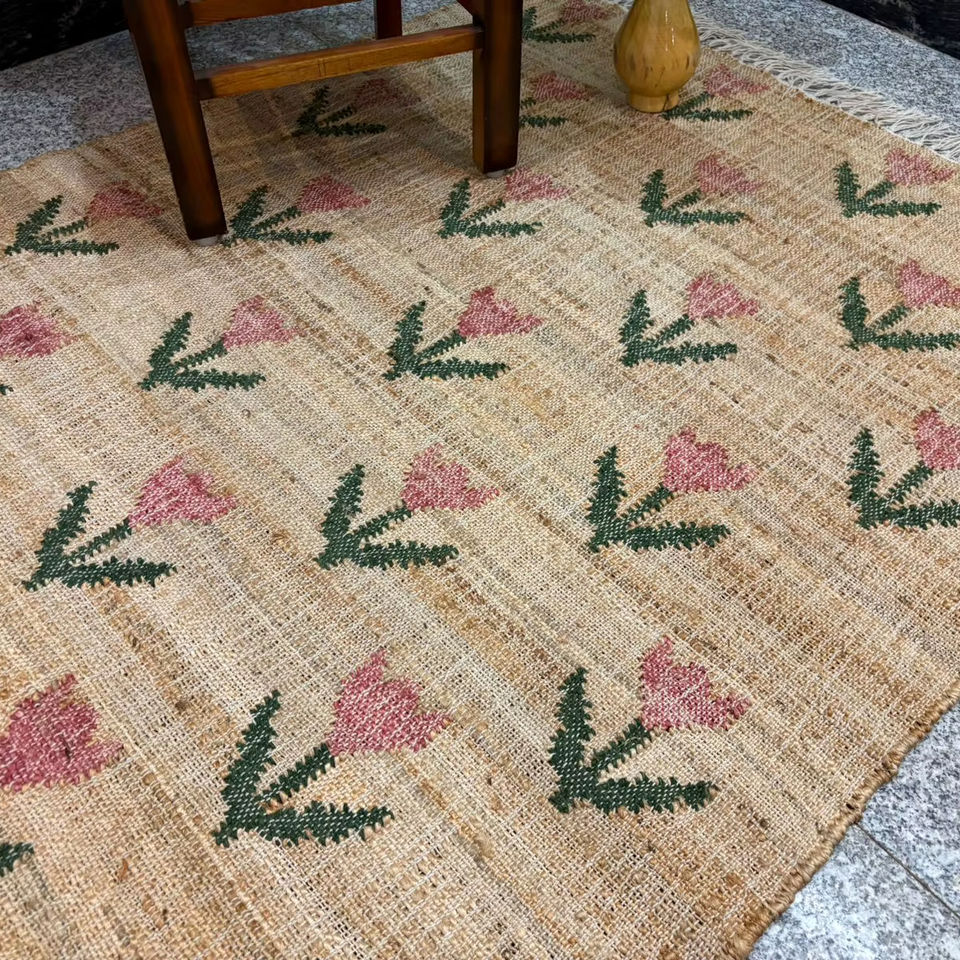 Handmade Jute Kilim Rug with Floral Pattern | Natural Fiber Low Pile Thin Boho Area Rug | Eco-Friendly Rustic Home Decor