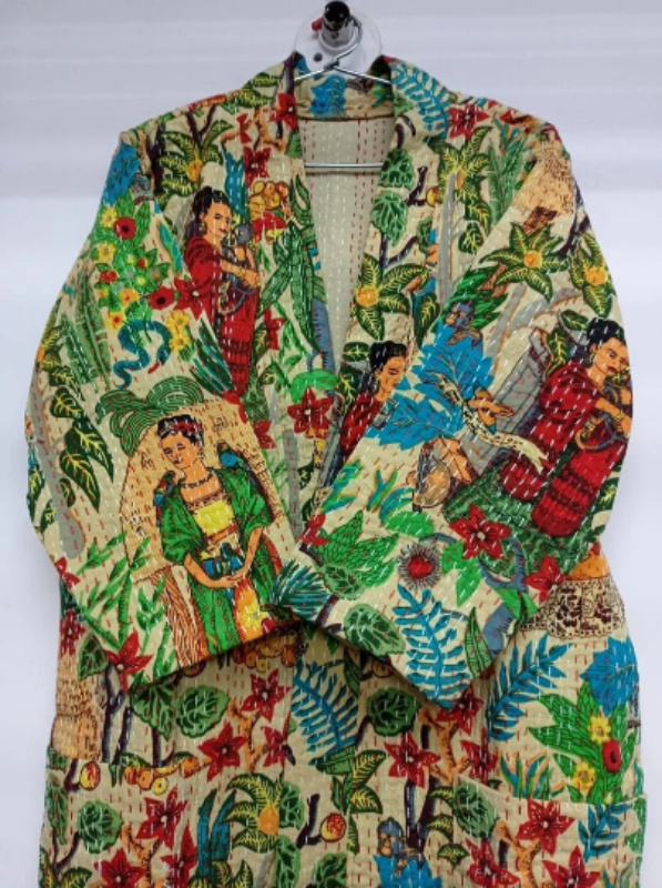 Handmade Kantha Robe and Jacket Japanese Style Floral Print Winter Coat with Boho Tie Belt Varsity Jacket