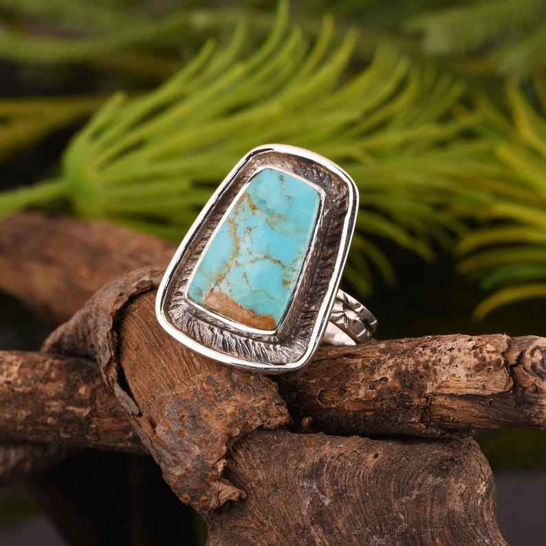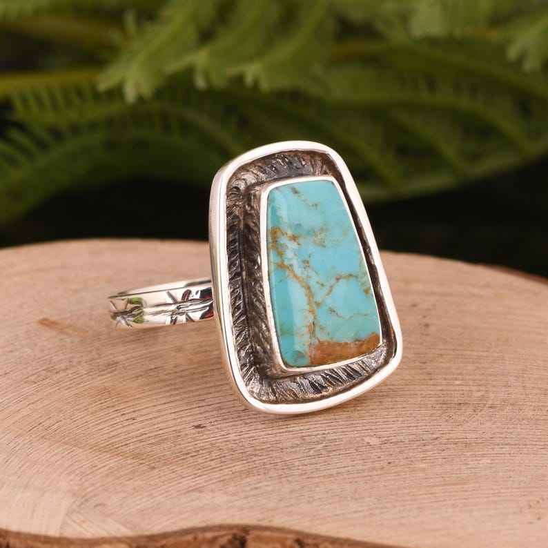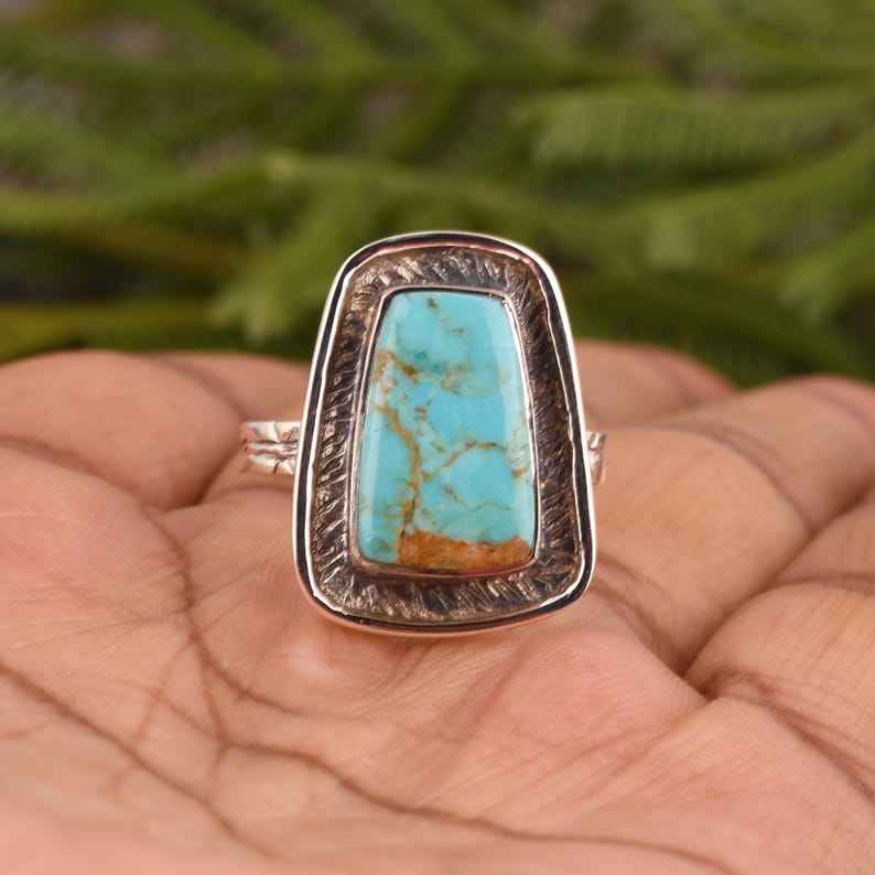Handmade Kingman Turquoise Ring Oxidized Sterling Silver Boho Statement Jewelry Southwestern Artisan Ring for Him or Her