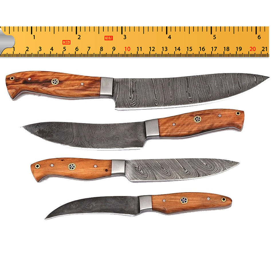 Handmade Kitchen Knife Set Solid Damascus Steel Custom Made Sharp Chef Knife Stainless Steel Leather Roll Bag Wooden Handle