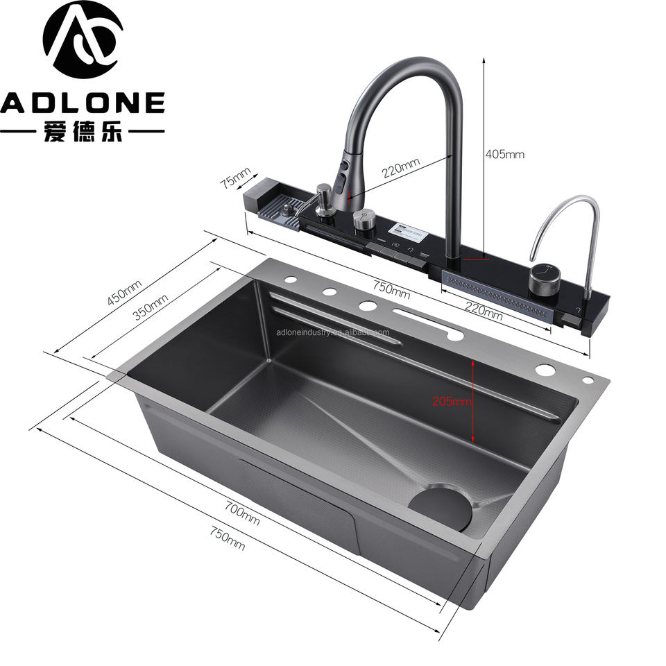Handmade LED Display Piano Key Nano Black Kitchen Sink Double Bowl Undermount Cup Washer Stainless Steel Handmade Waterfall