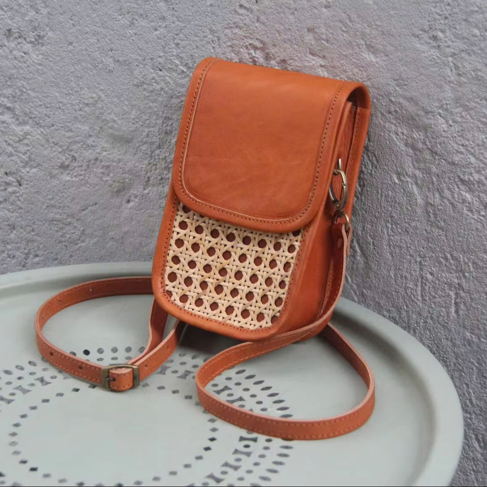 Handmade Lady Style Summer Mini Rattan Leather Phone Bag Canvas Mobile Phone Purse with Pattern Canvas Material