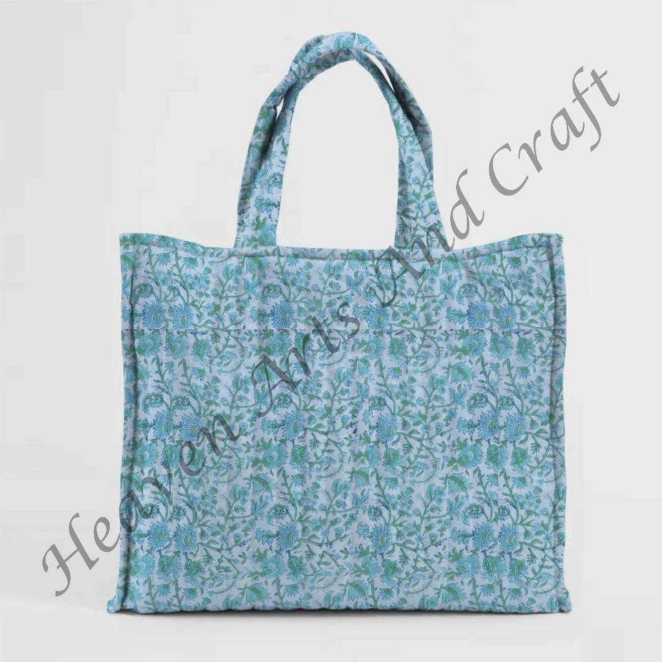 Handmade Large Cotton Quilted Square Floral Block Print Boho Style Quilted Tote Bag Logo And Custom Pattern Woven Shopping Bag