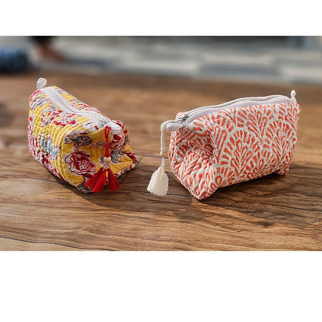 Handmade Large Cotton Zipper Toiletry Bag for Women Floral Quilted Block Print Cosmetic Case Travel Makeup Pouch