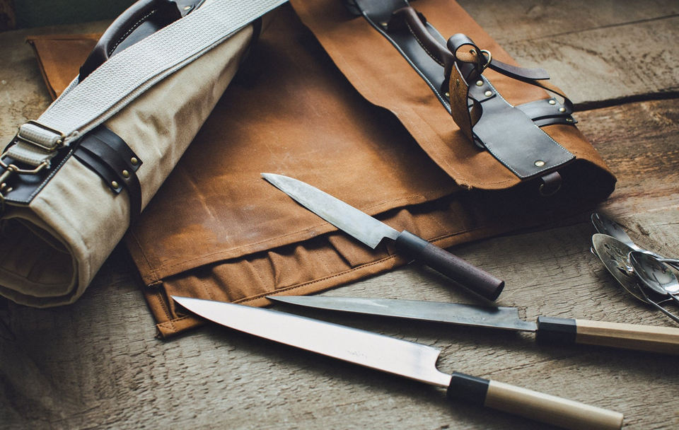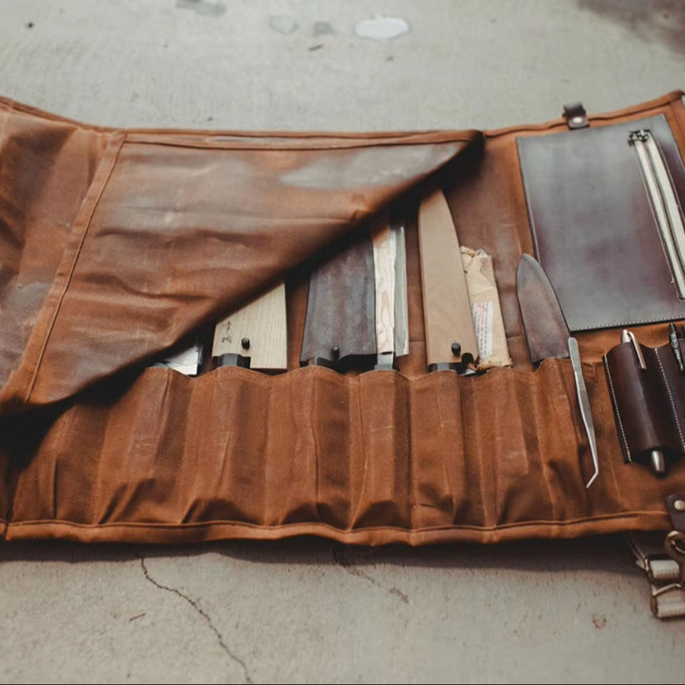 Handmade Luxury Leather Canvas Foldable Comfortable Smell Proof Knife Roll Bag Chef Culinary Knife Organizer Travel Kitchen Use