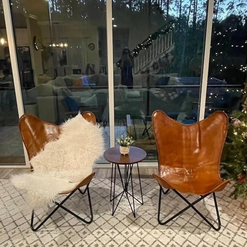 Handmade Tan Side Butterfly Chair with Iron Frame Foldable Leather Leisure Chair for Outdoor or Bedroom in Rustic Style