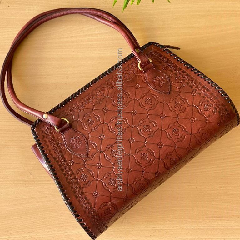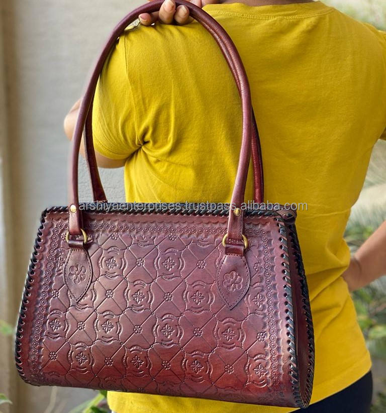 Handmade Leather Tote Bag for Women's Vintage Floral Design Shoulder Handbag with Top Handle for Everyday Use Pure Leather Purse