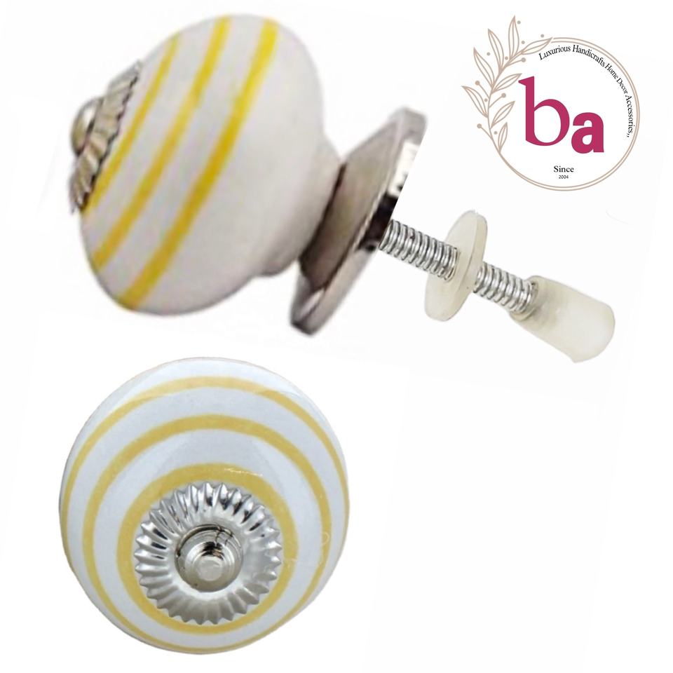 Handmade Ceramic Knobs CK 558 Lemon Yellow Strips with White Colour for Drawer Cabinets Wardrobes Dressers Bedrooms Kitchen Use