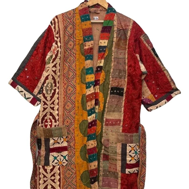 Handmade Long Kantha Jacket for Women Embroidered Cut Work Coat with Vintage Quilted Design Letter Pattern Jacket