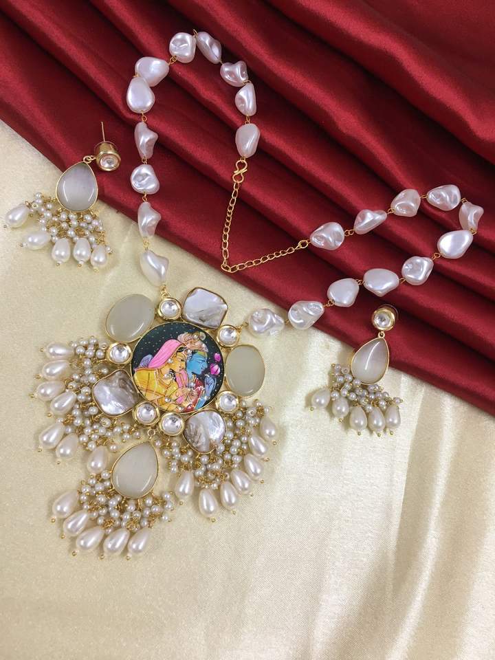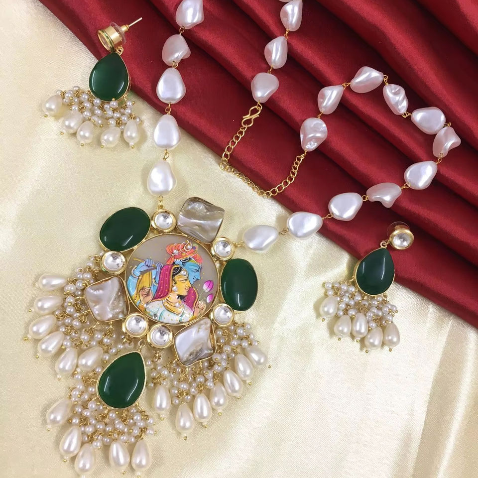 Handmade Long Necklace With Monalisa Stone With Pearl Necklace With Earrings Classic Jewellery Brass For Wedding And Party