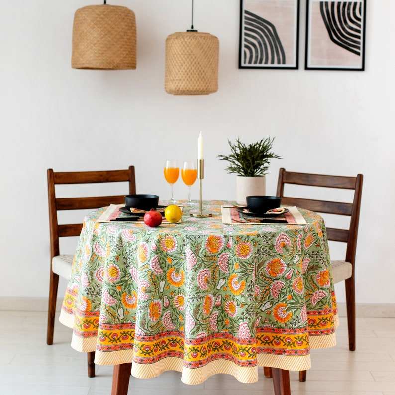 Handmade Luxury 6-Seater Rectangular Floral Indian Block Print Cotton Tablecloth with Square Napkin Set Customized Color