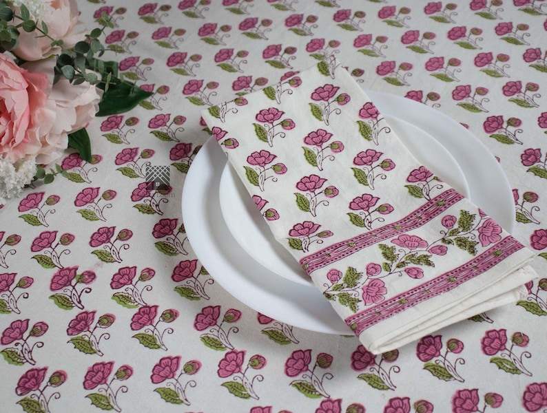 Handmade Luxury Pink Cotton Floral Design Indian Block Print Tablecloth Vintage Dining Table Cover for Housewarming Wedding