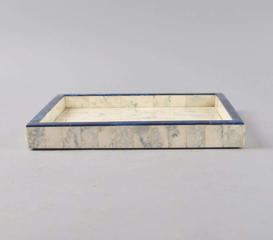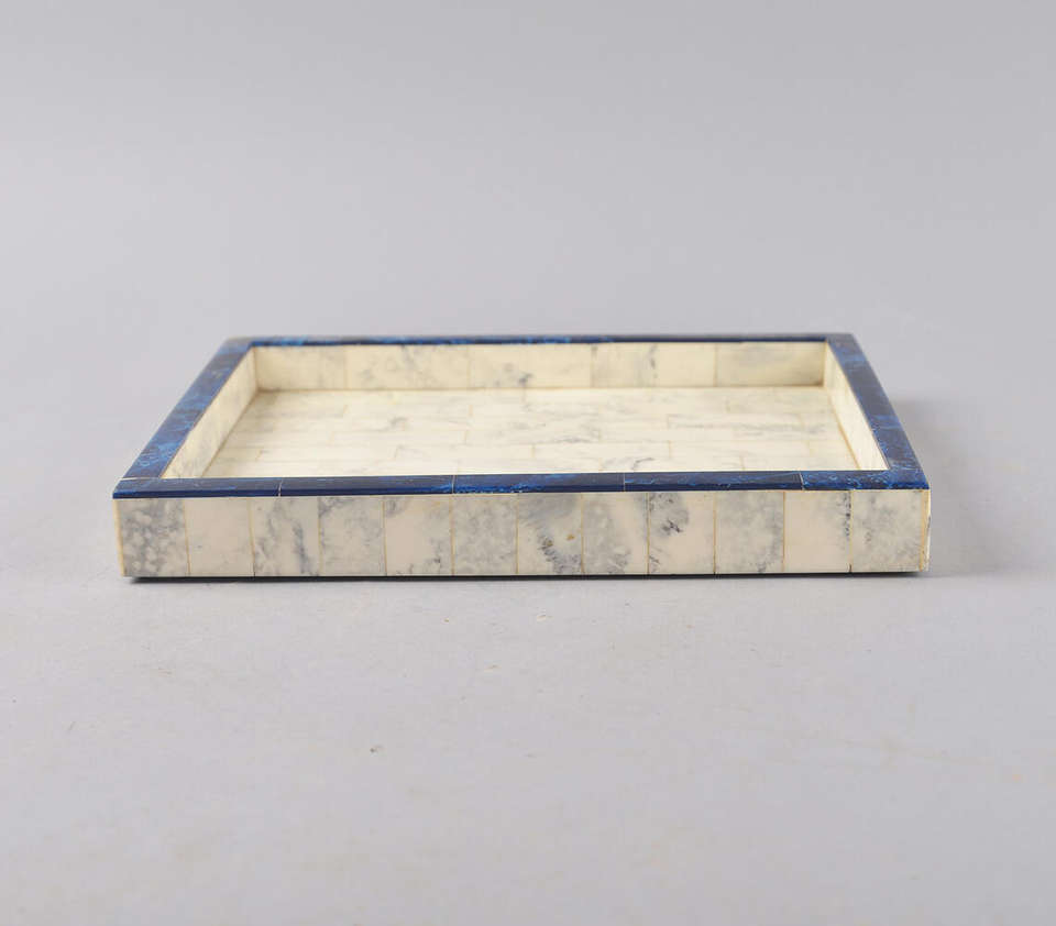 Handmade Luxury White Marble Effect Bone Inlay Serving Tray With Vibrant Blue Resin Border Accents Premium Rectangular Decor