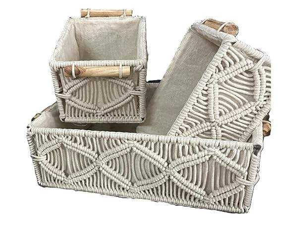Handmade Macrame Cotton Storage Baskets with Wooden Handles Boho Woven Organizer for Home Decor, Nursery & Bathroom Storage