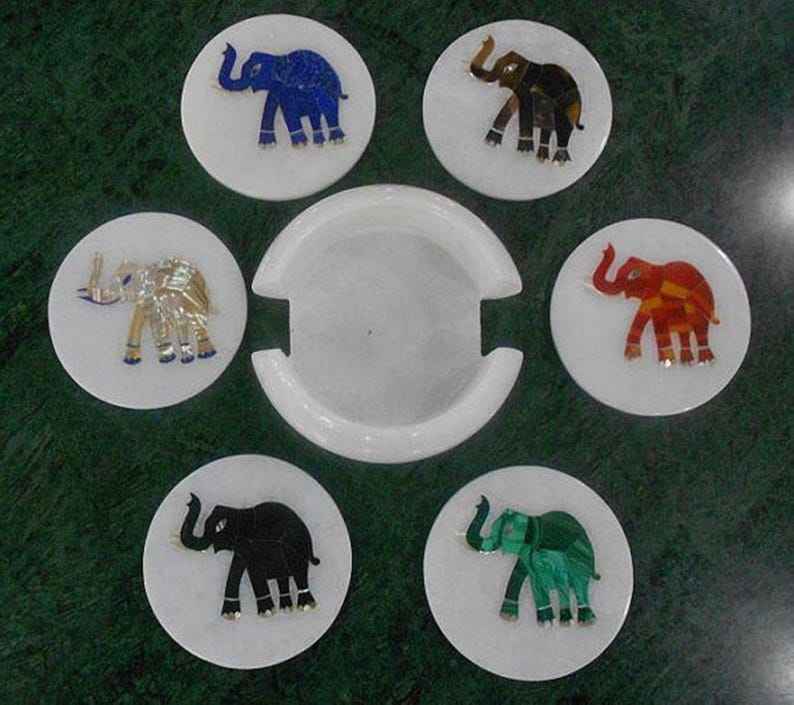 Handmade Marble Coaster Set White Tea Drinkmats 4.5 Inches Stone Inlay Wine Glass Holder