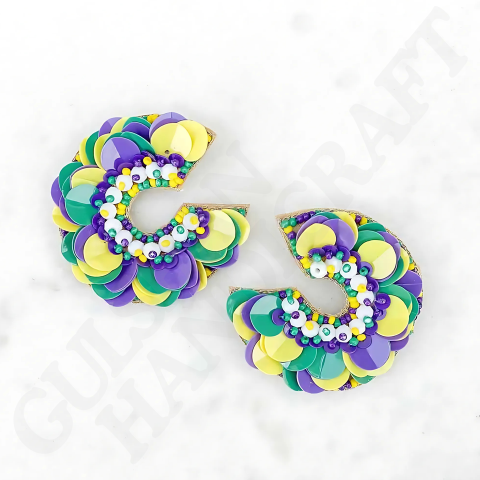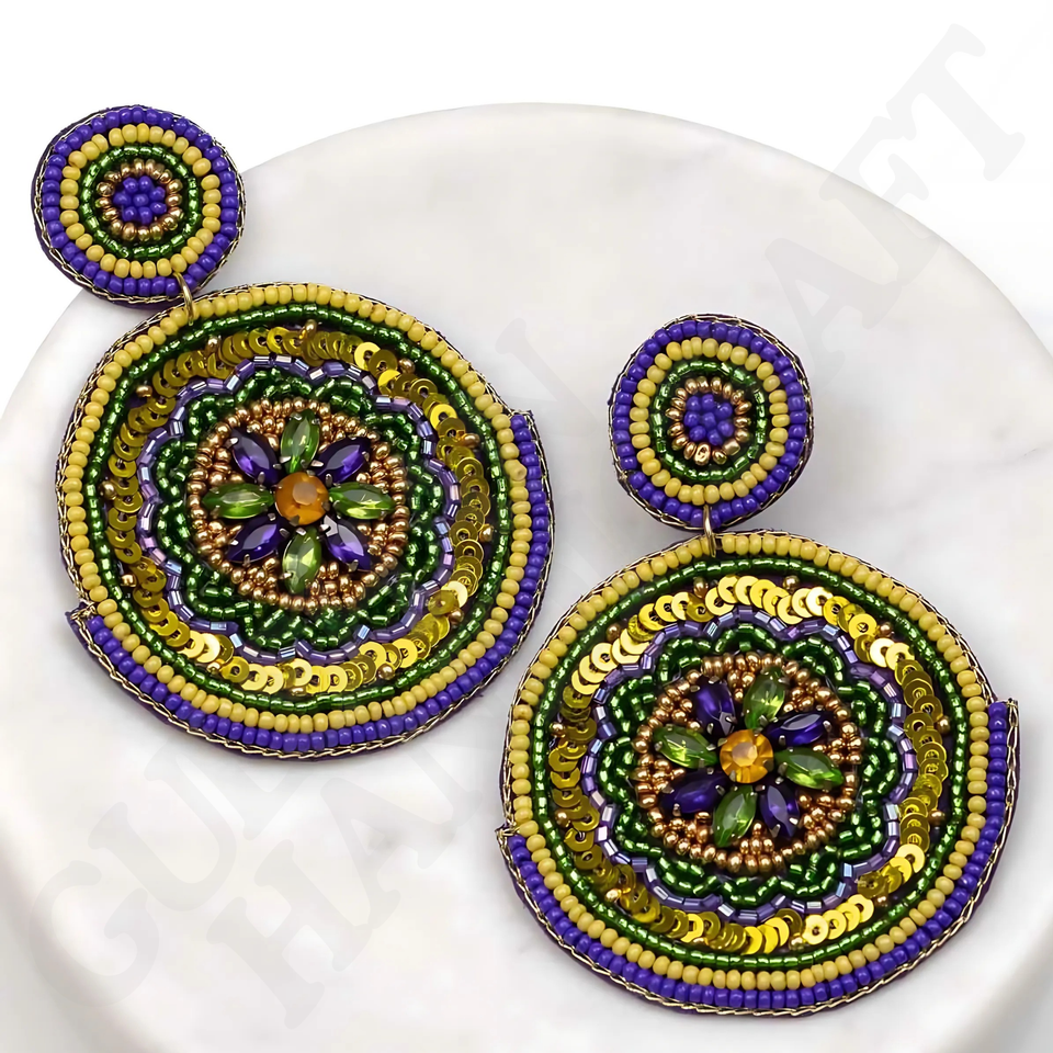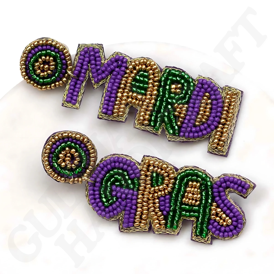 Handmade Mardi Gras Festive Beaded Earrings Purple Green Gold Parades Celebrations Carnival Season Fashion Drop Jewelry