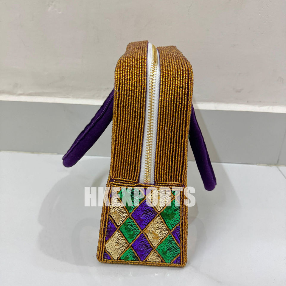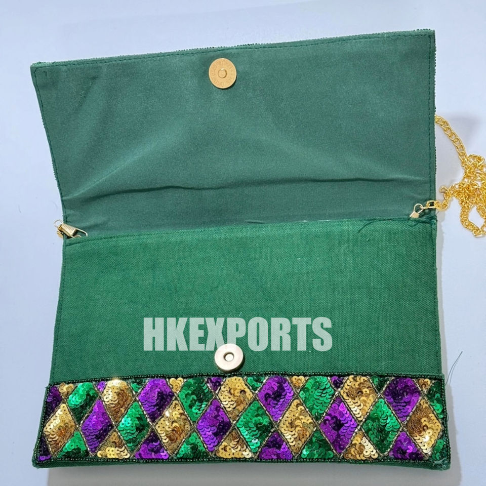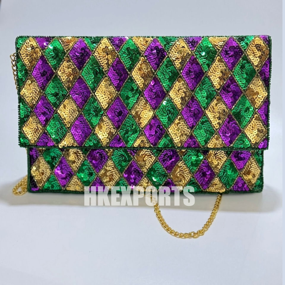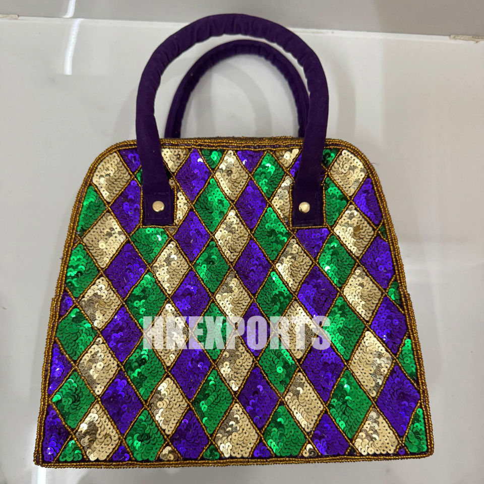 Handmade Mardi Gras Sequin Handbag Purple, Green, and Gold Harlequin Pattern Tote for Parades, Festivals, and Celebrations