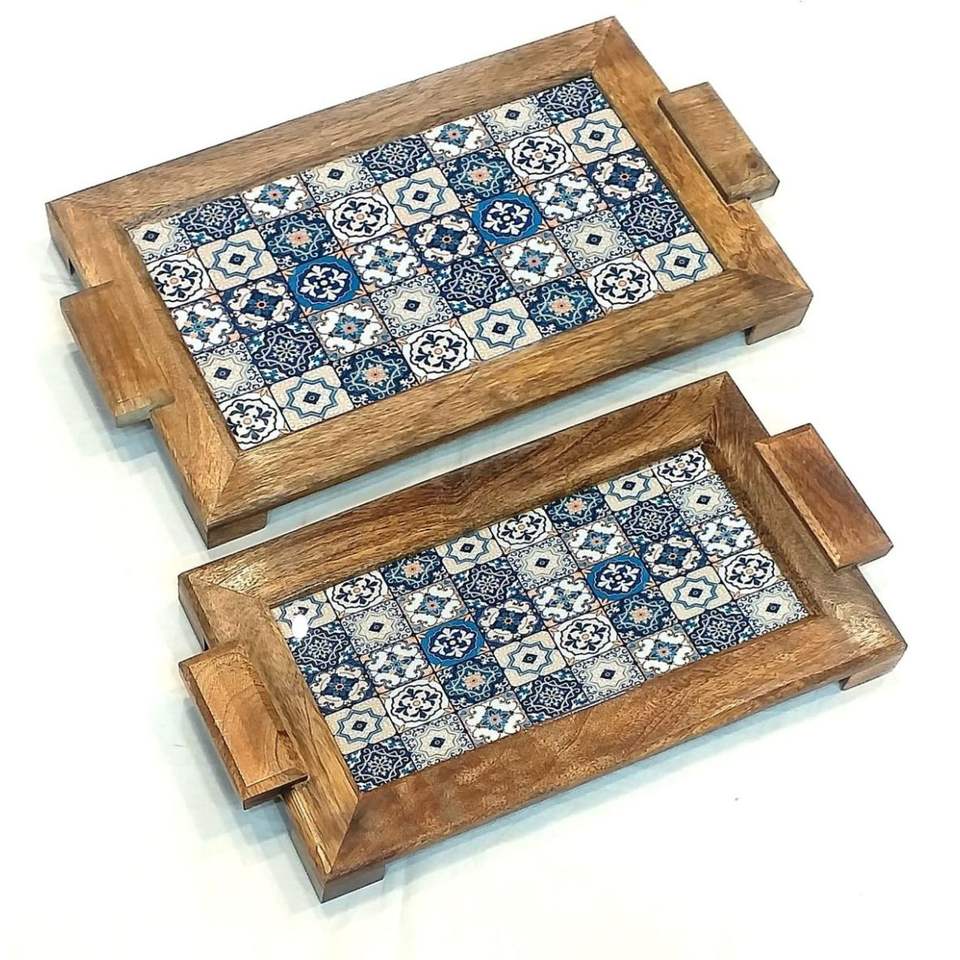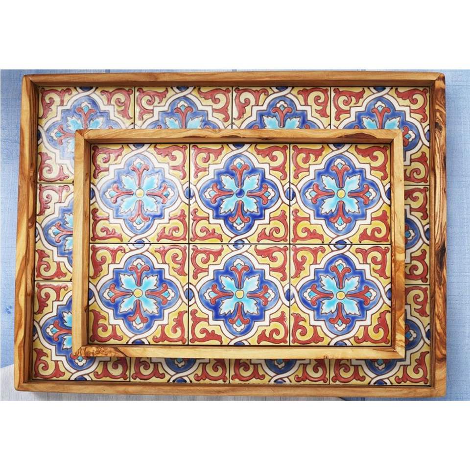 Handmade Mediterranean Enameled Tile Inlay Solid Wood Serving Tray Set Decorative Turkish Style Rectangular Wooden Food Trays