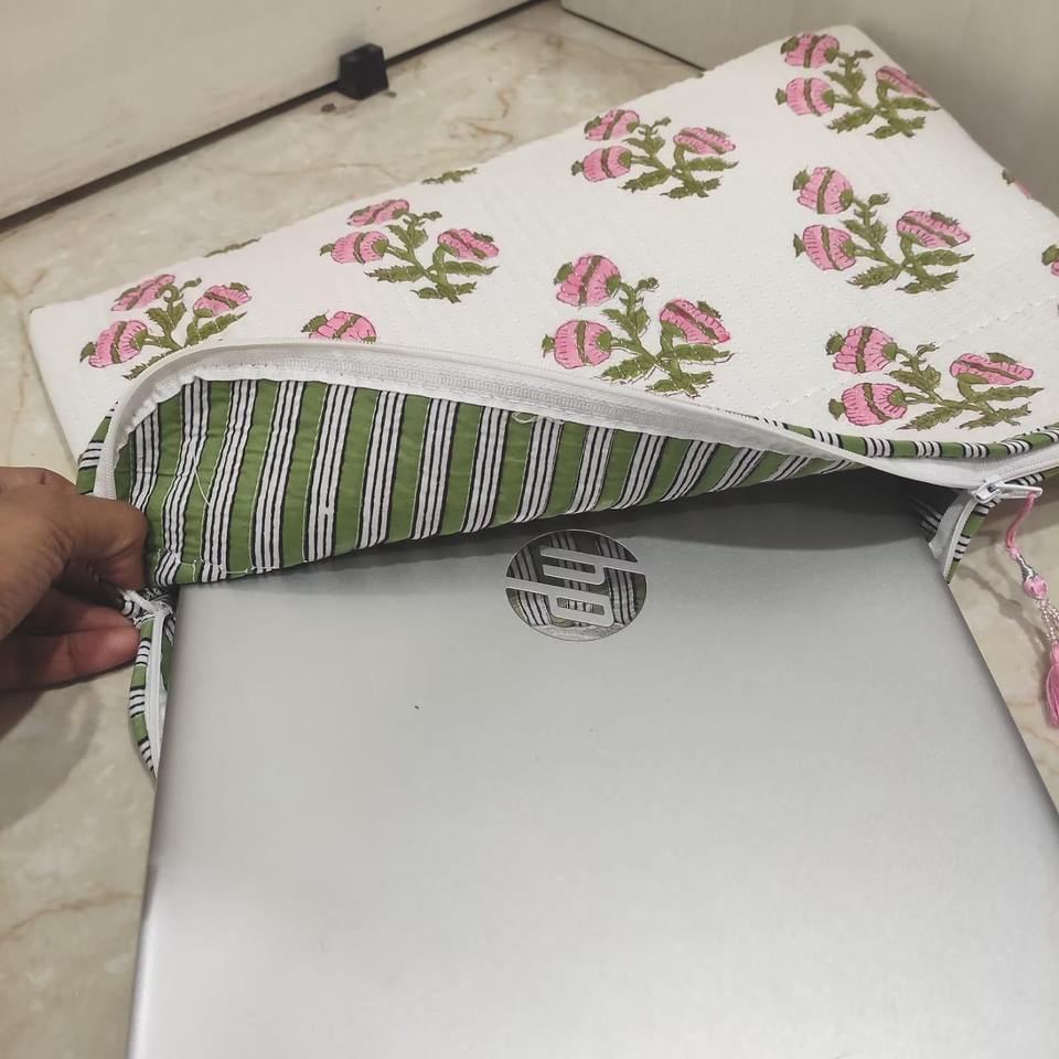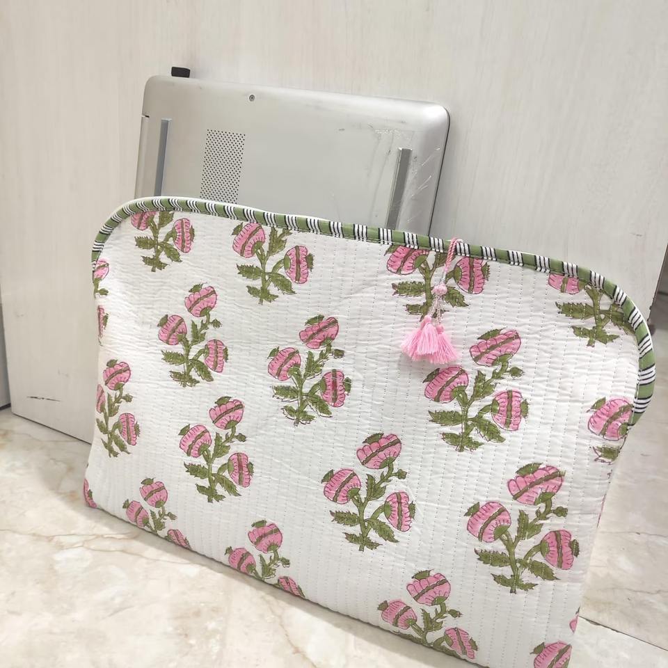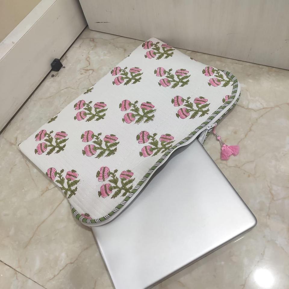Handmade Modern Durable White Floral Print Cotton Quilted Laptop Sleeve Pouch Bag Unique Gift Idea Daily Use Lightweight Tablet