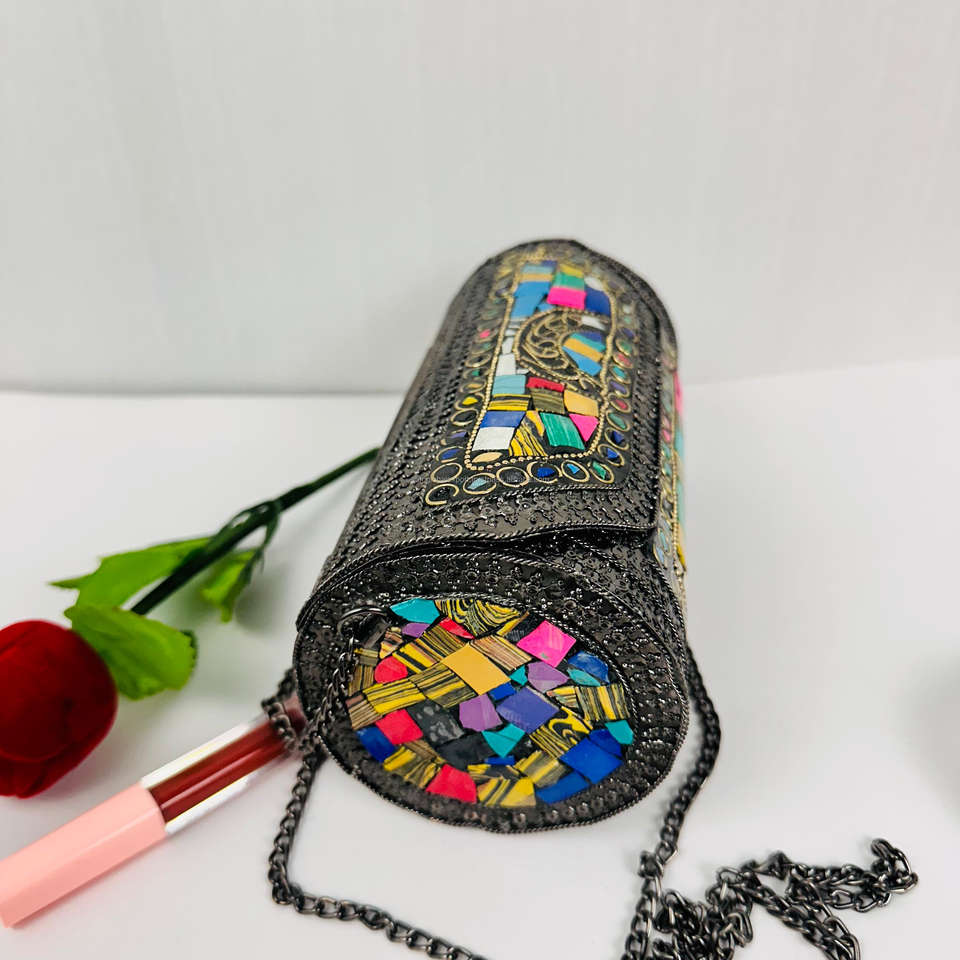 Handmade Modern Ethnic Antique Evening Purse New Modern Ethnic Antique Clutch Bag Cylindrical Metal Mosaic Inlay Metal Crafts