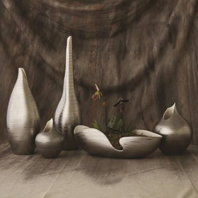 Handmade Modern Silver Flower Vase Platinum Stripe Ceramic Table Centerpiece for Home Decor Decorative Silver Vase
