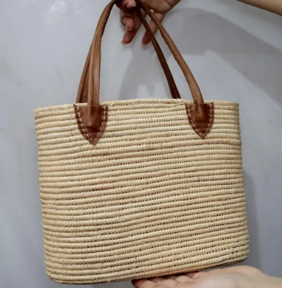 Handmade Moroccan Raffia Tote Bag with Leather Handles, Woven Straw Shoulder Bag