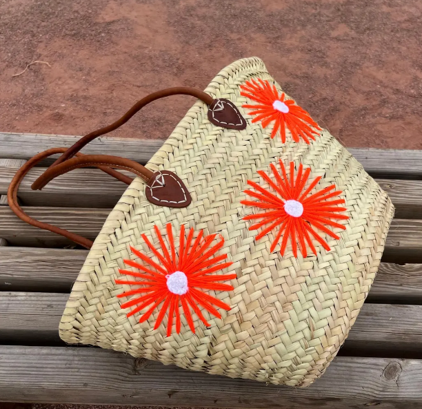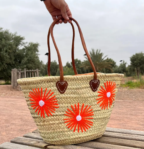 Handmade Moroccan Straw Basket with Orange Flower Embroidery Woven Palm Tote Bag with Leather Handles