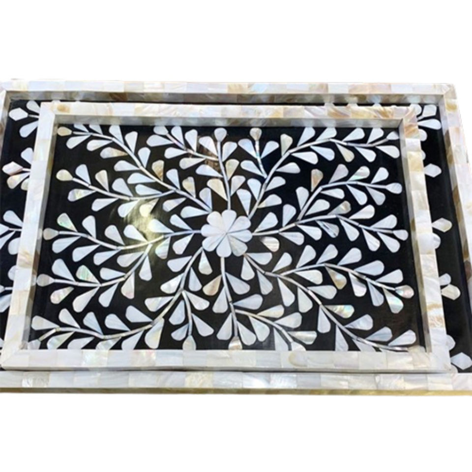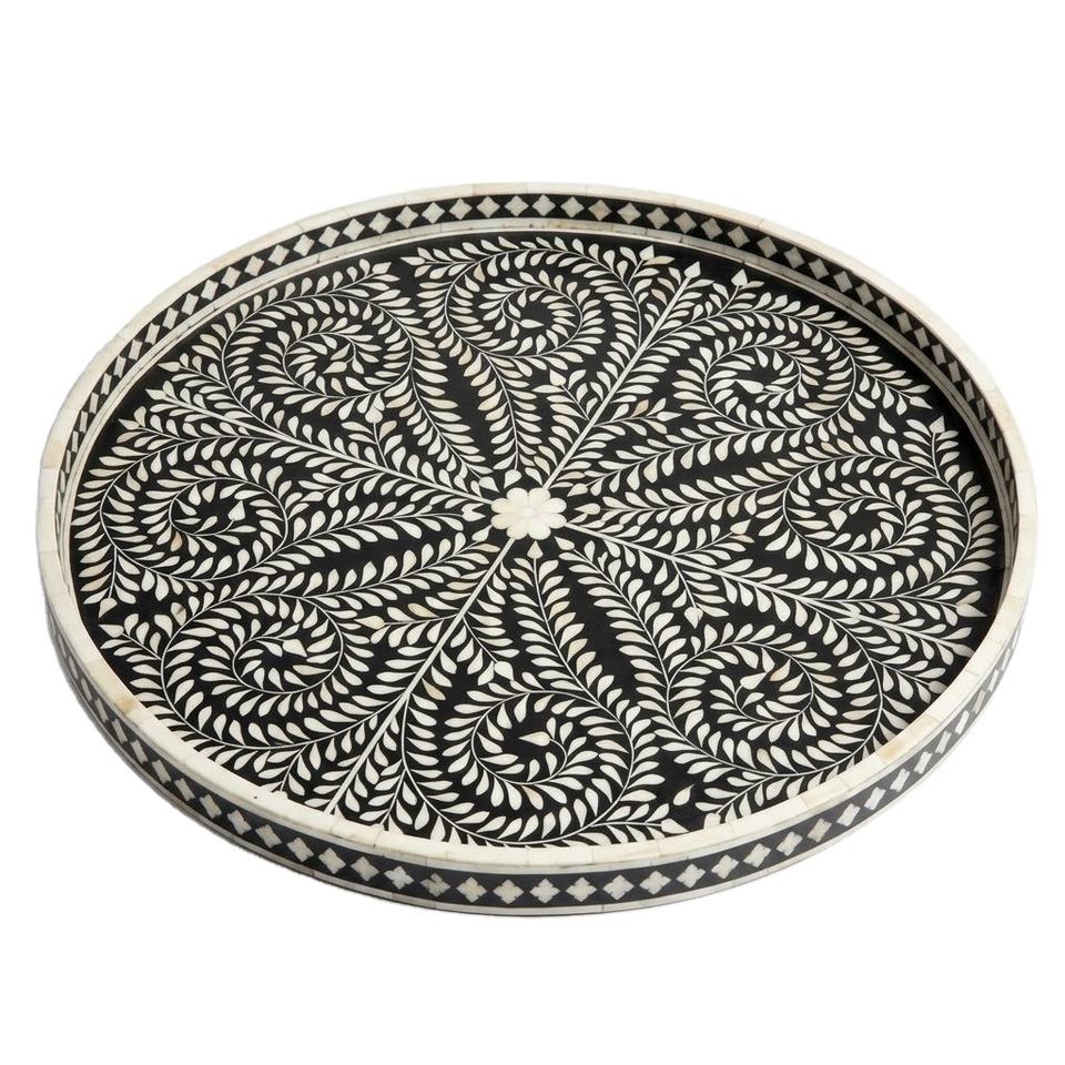 Handmade Mother Of Pearl Inlay Round Serving Tray Black Floral Pattern Bone Inlay Decorative Tray For Coffee Table Home Kitchen