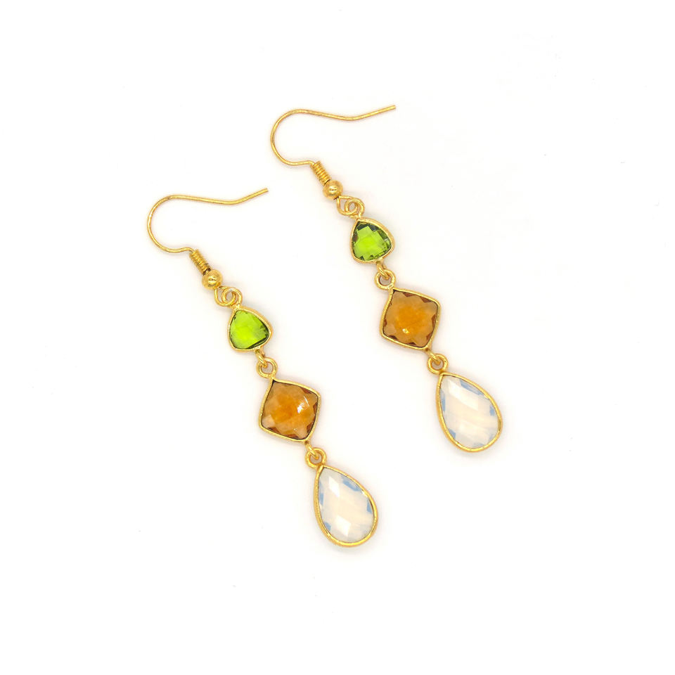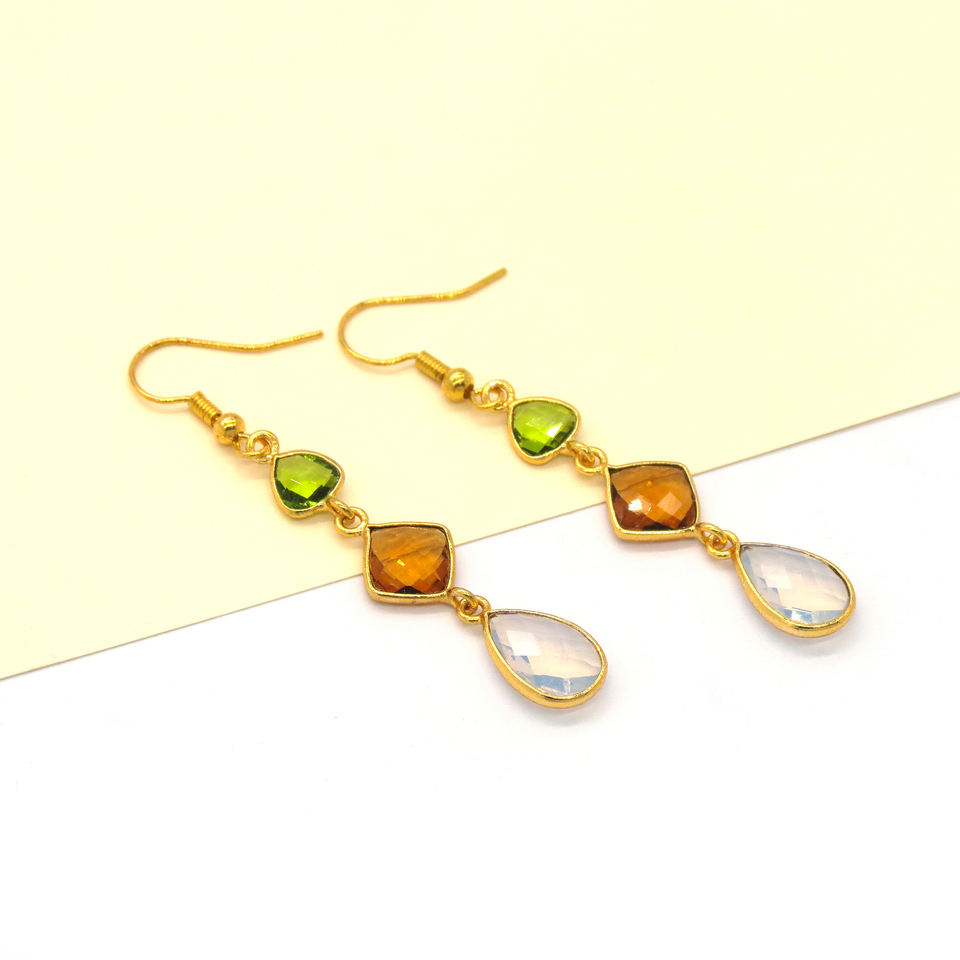 Handmade Wedding Bohemia Flower Shape Multi Gemstone Dangle Hook Earrings | Peridot Citrine Opalite | 18K Gold Plated