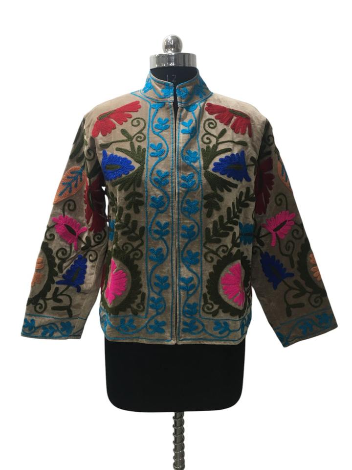 Handmade Multicolor Suzani Embroidered Velvet Jacket for Women Floral Design Breathable Handcrafted Short Length Artisan Jacket