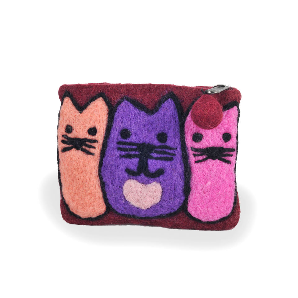 Handmade In Nepal Women Ladies Wallet Crafted From New Zealand Wool A Charming 3 Cat Design Attractive Stylish & Fashionable