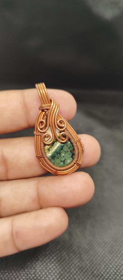 Handmade Natural Ocean Jasper Pendant Copper Wire Wrapped Gemstone Jewelry Link Chain Pear Shape Bezel Setting Women's Antique