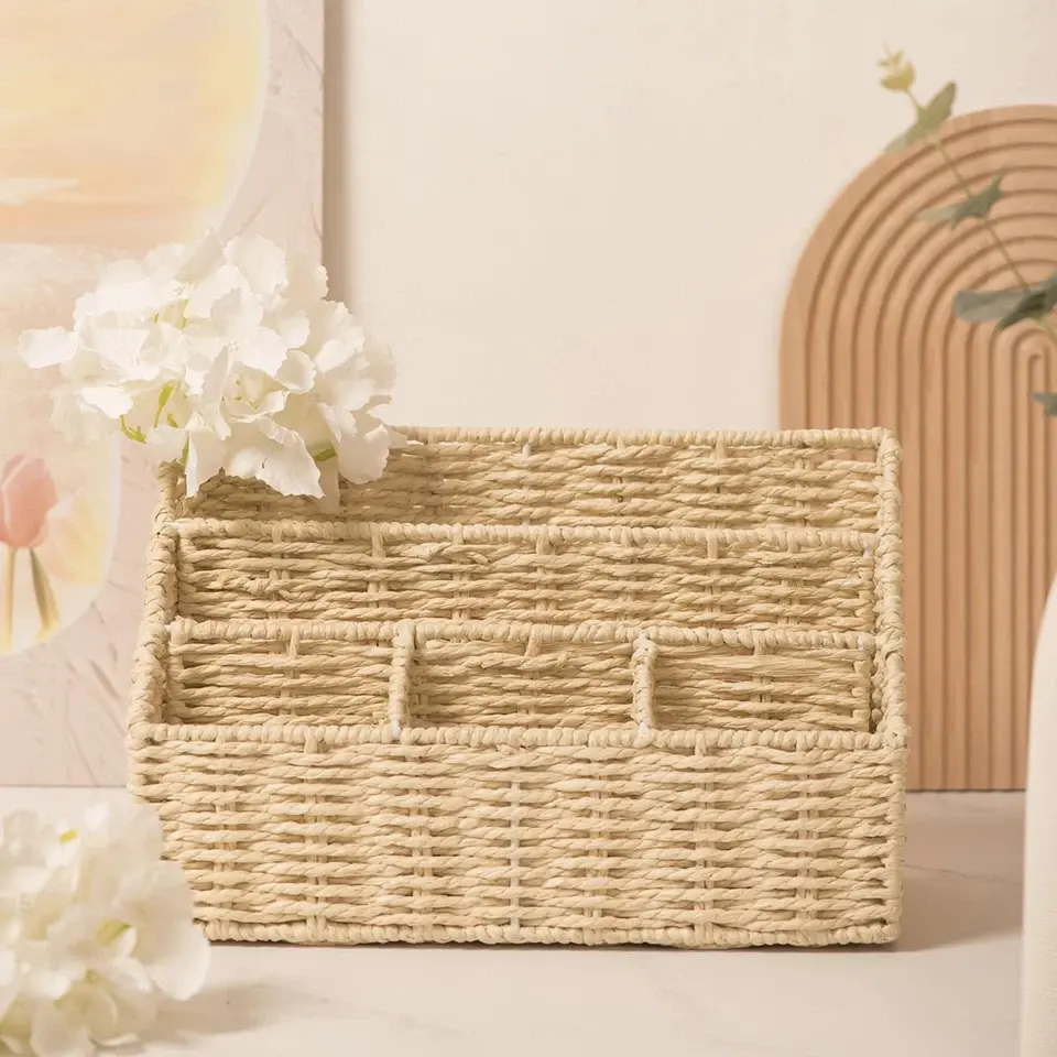 Handmade Natural Rattan Desk Organizer with Multiple Compartments Woven Storage Box for Office Supplies Makeup Remote Control