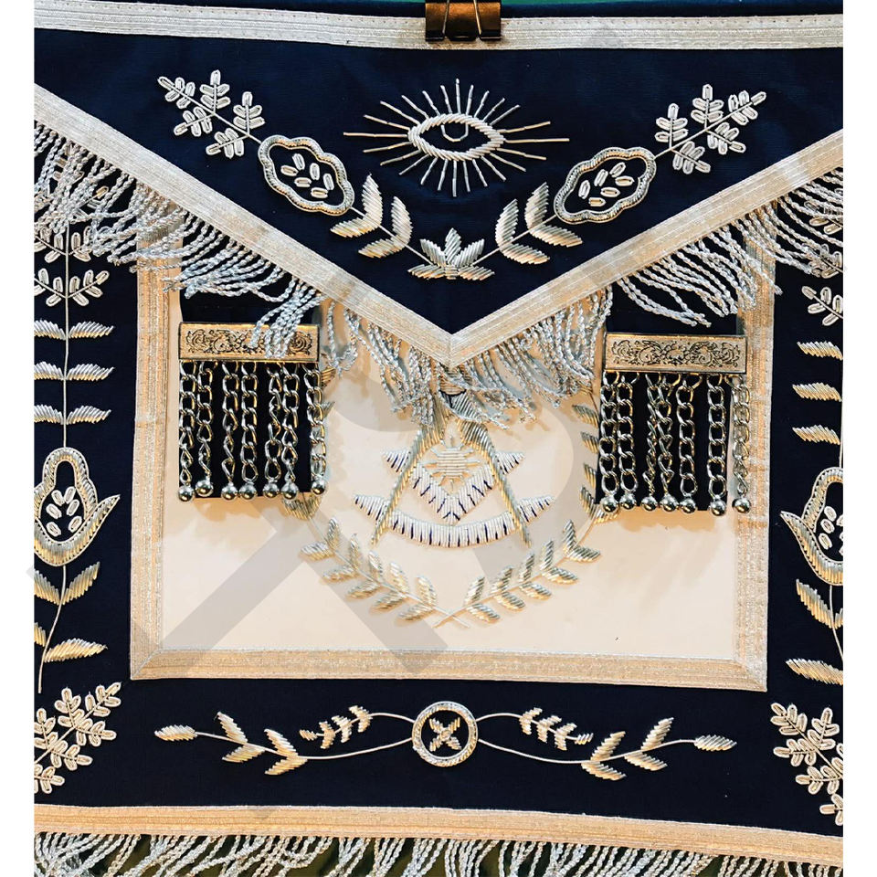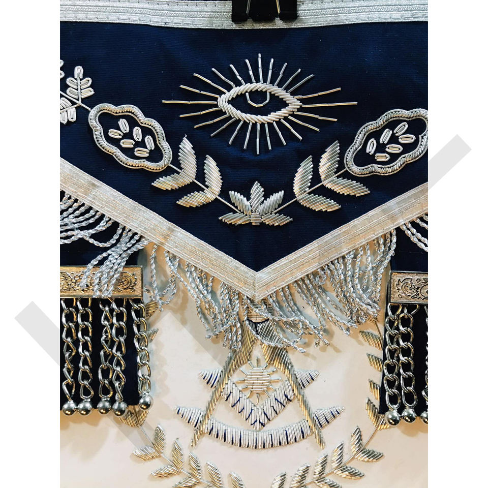 Handmade Navy Blue Masonic Master Mason Apron with Silver Bullion Embroidery and Fringe – Premium Lodge Regalia