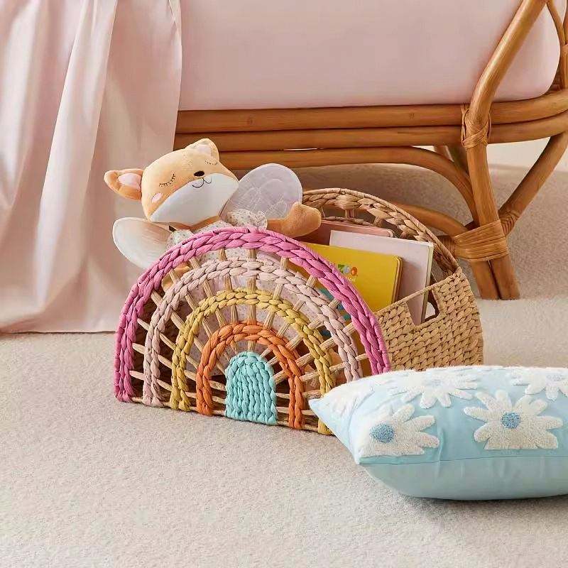 Handmade Nordic Style Woven Storage Basket New Water Hyacinth Basket with Rainbow Decoration for Shelves and Pantry Storage